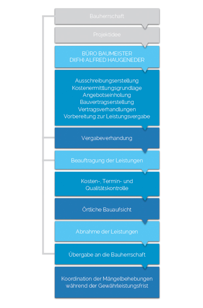 Ausführungspläne, Abnahmetermine und Zeitpläne, Dienstleister und bauausführende Unternehmen, behördliche und rechtliche Vorgaben: In der eigentlichen Bauphase gibt es eine große Anzahl an individuellen Faktoren, die es zu überwachen und zu koordinieren gilt. Wir übernehmen diese Aufgaben fachgerecht und zuverlässig, damit Ihr Bauvorhaben termingerecht fertig gestellt wird.